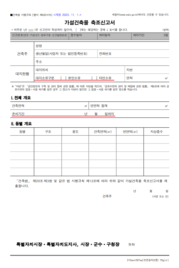 별지 제8호서식의 가설건축물 축조신고서