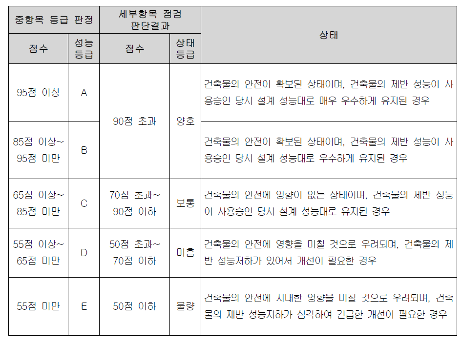 앞으로 건축물 점검시 “건축물의 법규 준수, 기능 유지, 구조 및 화재 안전 성능 확보 여부 등을 확인”하고 “법규 위반 및 성능 미달(저하)된 부분에 대해서는 개선이 필요”함을 좀 더 명확히 할 필요가 있겠습니다.