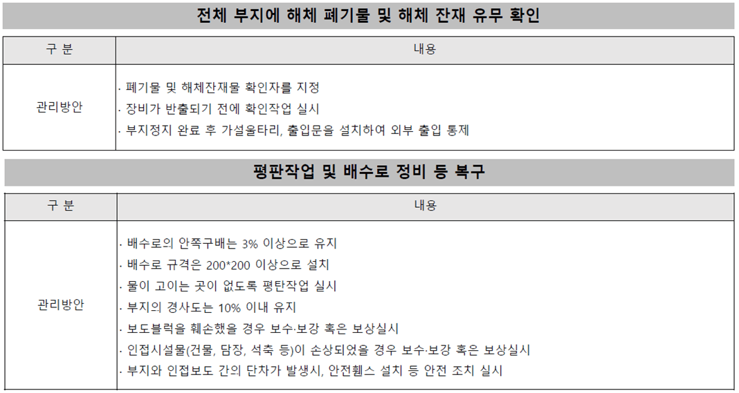 • 되메우기 및 평탄 작업, 배수로 정비 등 복구 계획