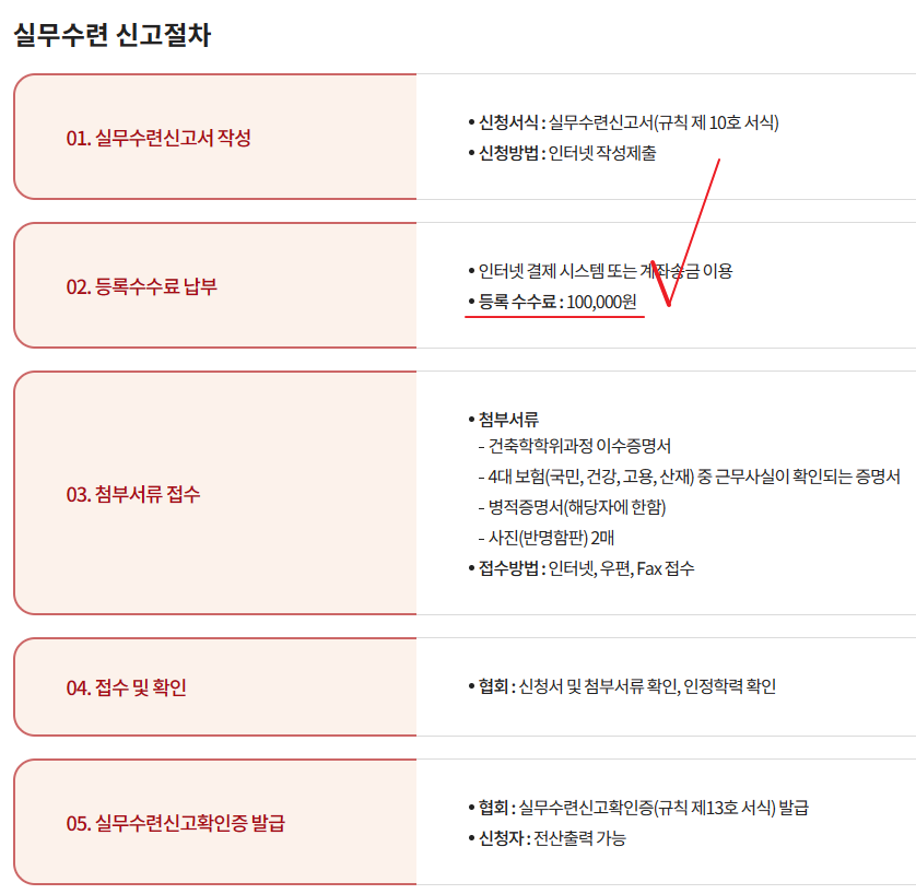 – 실무수련을 받으려는 사람은 국토교통부령으로 정하는 서류를 갖춰 국토교통부장관으로부터 위탁받은 실무수련 관리기관인 ‘대한건축사협회 건축사등록원(KARB)’에 실무수련자로 신고하여야 합니다. (신고 시 10만 원의 등록수수료가 발생합니다.)