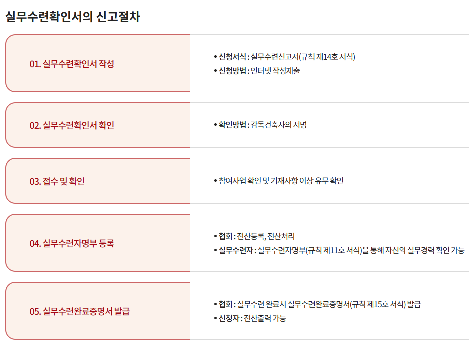 – 실무수련자가 수련경력을 인정받기 위해서는「실무수련확인서(건축사법 시행규칙 별지 제14호서식)」에 참여사업별/수련영역(설계, 공사관리, 기타) 별 수련기간을 기재하여 감독건축사의 확인을 받아 건축사등록원에 신고, 관리해야 합니다.
