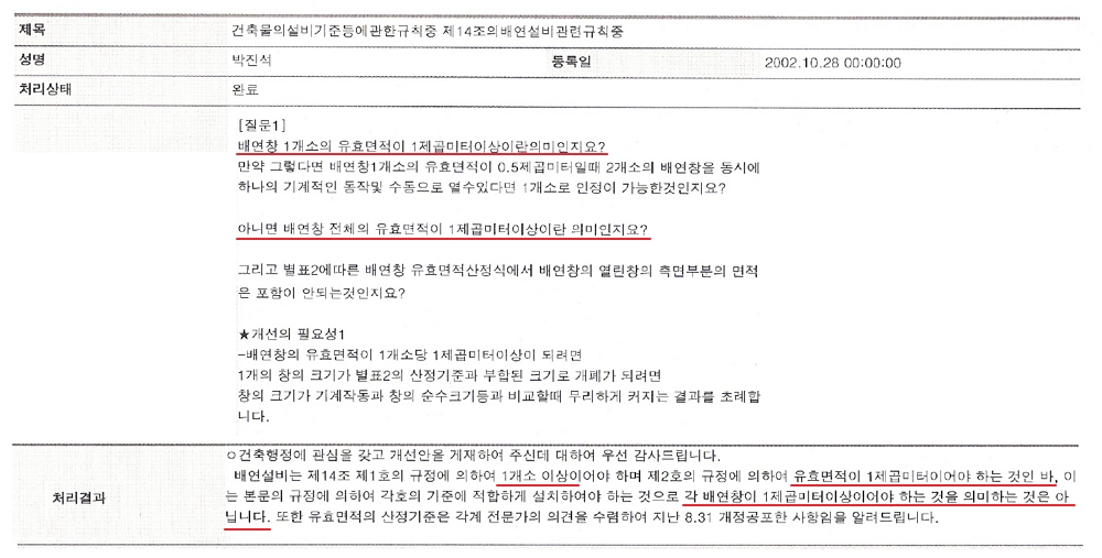 “배연창 설치기준 및 유효면적 관련 질의회신”