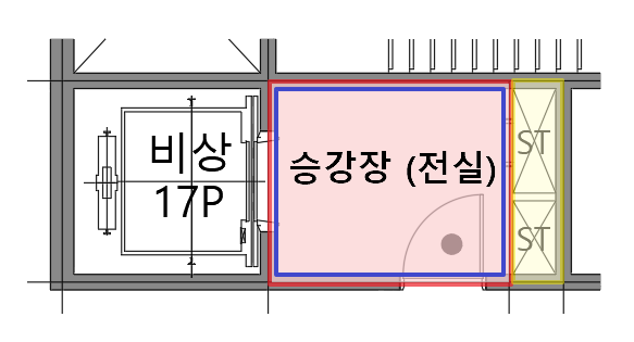 한편 건축관련 법규(설비규칙 제10조 제2호 바목)에서는 비상용 승강기 승강장(전실) 면적에 대해서 “6㎡이상 설치할 것” 기준이 있습니다. 그런데 이 승강장(전실) 면적을 산정할 때에 “어디를 기준으로 할 것인가?”(빨간색 : 벽체 중심선 or 파란색 : 안목 치수선)에 대해서 건축 실무에서는 혼선이 좀 있긴 합니다. 이번 글에서는 이 부분을 정확히 살펴보고 결론을 내도록 하겠습니다.