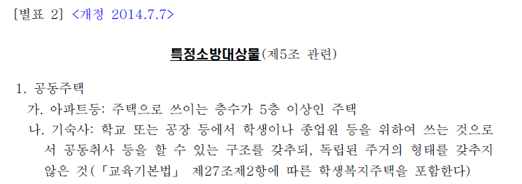 위에서 확인되듯이, 특정소방대상물에 “연립주택과 다세대주택”이 추가된 것을 알 수 있습니다.